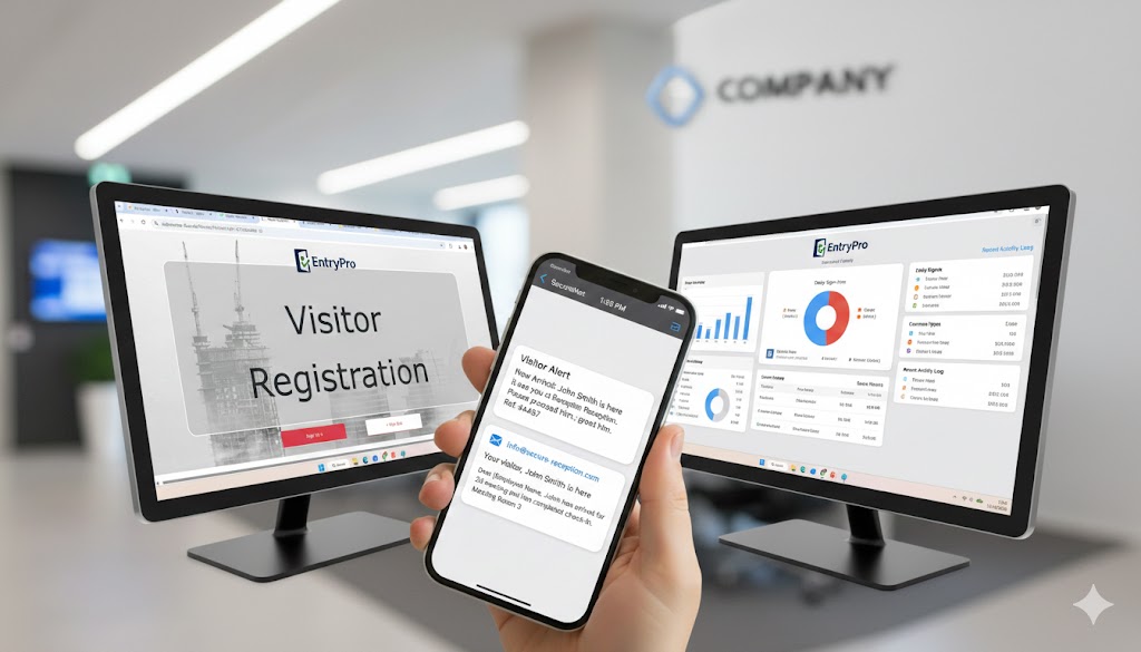 Is your current visitor sign-in process an outdated, insecure guestbook at the front door? First impressions matter. EntryPro replaces clunky, manual processes with a seamless, digital check-in system. Ensure GDPR compliance, enhance site safety, and present a cutting-edge image to every client, contractor and guest.